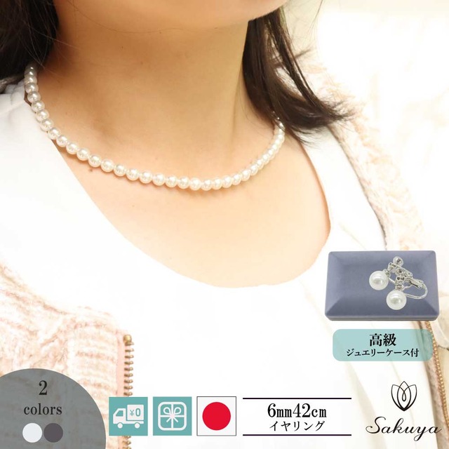 パール ネックレス フォーマル 冠婚葬祭 葬儀 結婚式 ジューンブライド 結婚式 成人式 真珠 イヤリング おすすめ パーティー 葬式 貝パール ネックレス 6mm42cm ホワイト シルバーブラック ケース付 成人のお祝い ネックレス単品