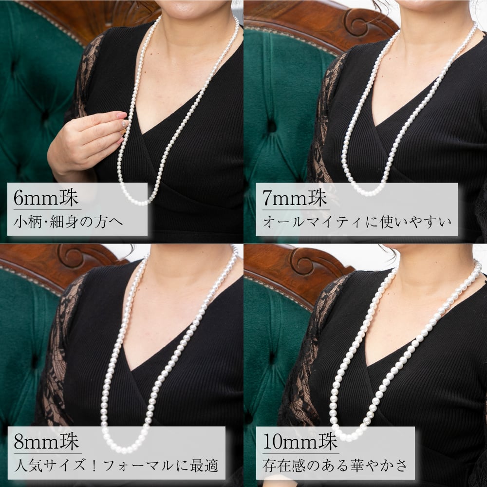 スタンダードな8mm珠×セミロング80cmは、ハレの日のアイテムにぴったり。さらりと一連でコーディネートにプラスするだけでぐっとトレンド感が増します。