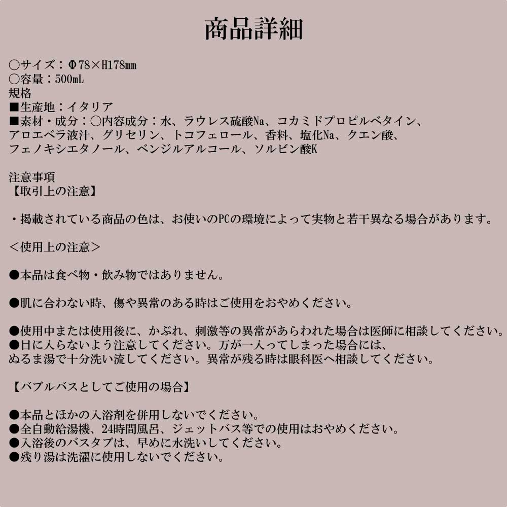 ■生産地:イタリア ■素材・成分:〇内容成分:水、ラウレス硫酸Na、コカミドプロピルベタイン、アロエベラ液汁、グリセリン、トコフェロール、香料、塩化Na、クエン酸、フェノキシエタノール、ベンジルアルコール、ソルビン酸K