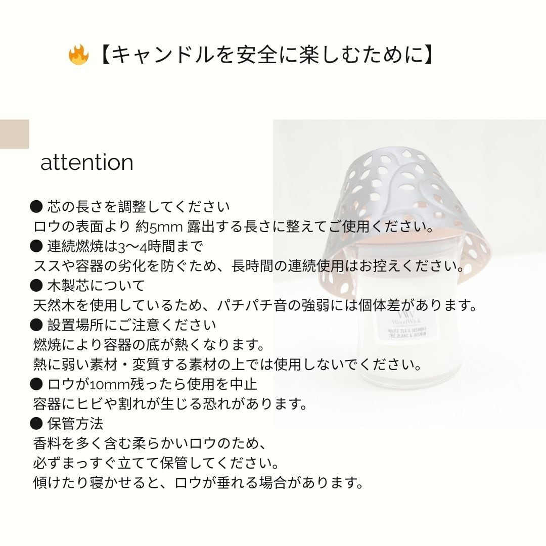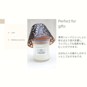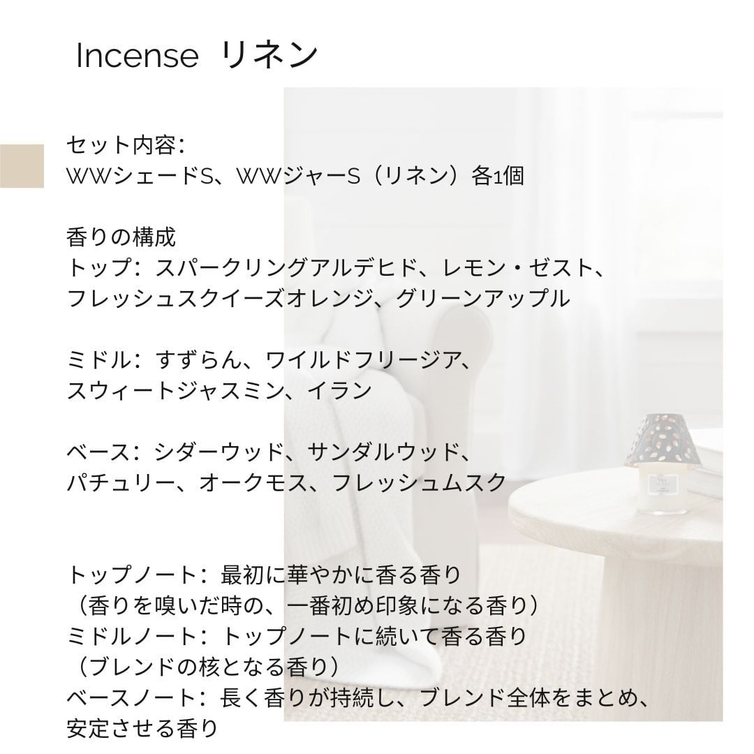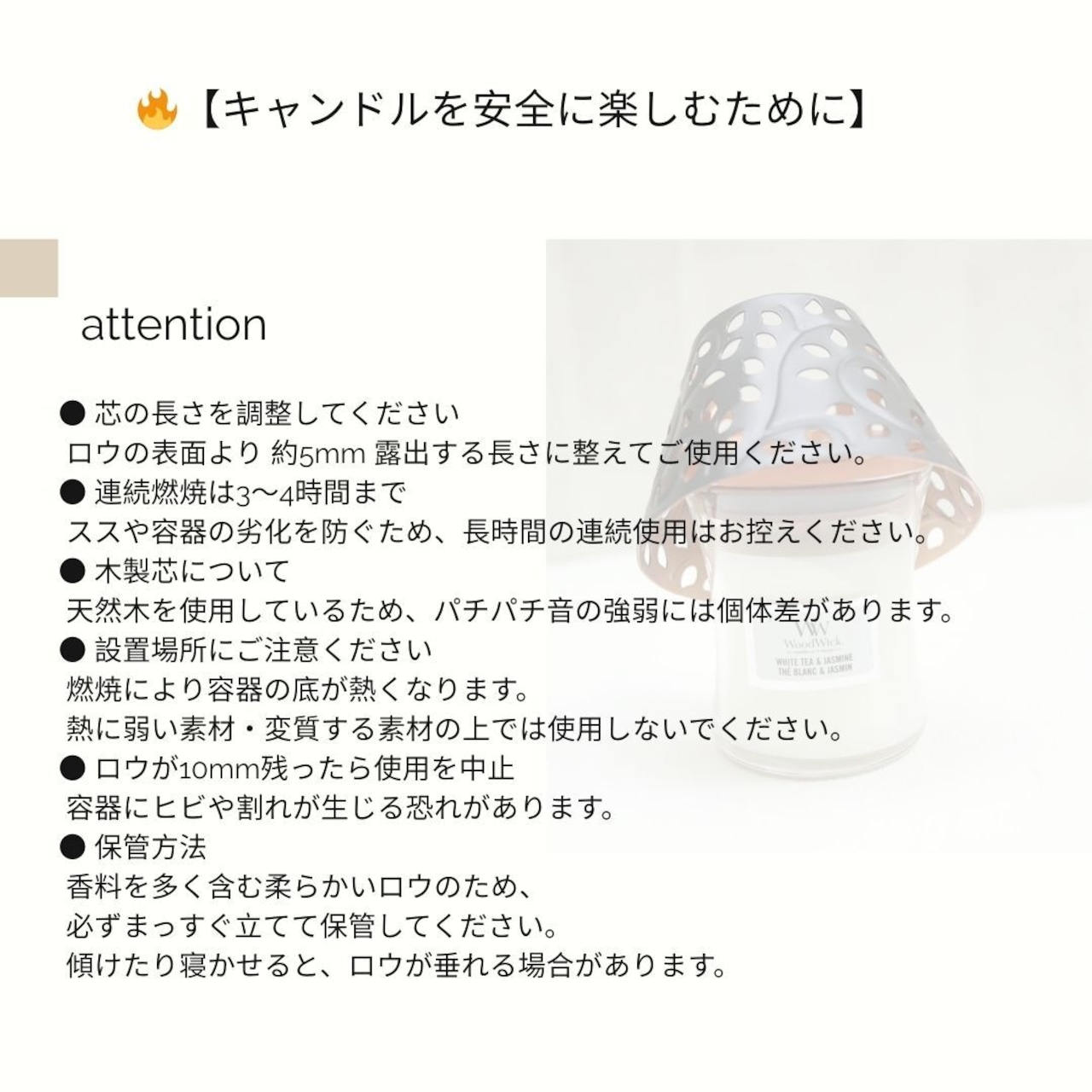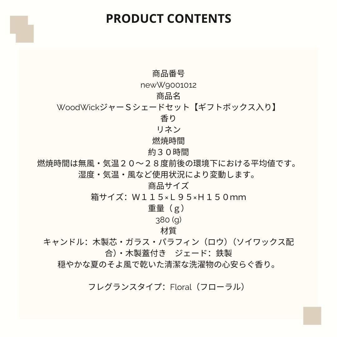 商品名 WoodWick ジャー S 商品サイズ 箱サイズ:W115×L95×H150mm 重量(g) 380 (g) 材質 キャンドル:木製芯・ガラス・パラフィン(ロウ)(ソイワックス配合)・木製蓋付き ジェード:鉄製 「リネン」 穏やかな夏のそよ風で乾いた清潔な洗濯物の心安らぐ香り。 「ラベンダースパ」 ラベンダーとユーカリのエッセンシャルオイルをブレンド。上質なスパでくつろぐ香り。 「ホワイトティー&ジャスミン」 ジャスミンがほんのり香るホワイトティーに、レッドシダーとローズのアクセント。 「シーサイドネロリ」 ネロリの花とマンダリンを含んだ、涼やかで潮風を感じる海辺の香り。 【こちらはシェードとセットの販売のページです。】
